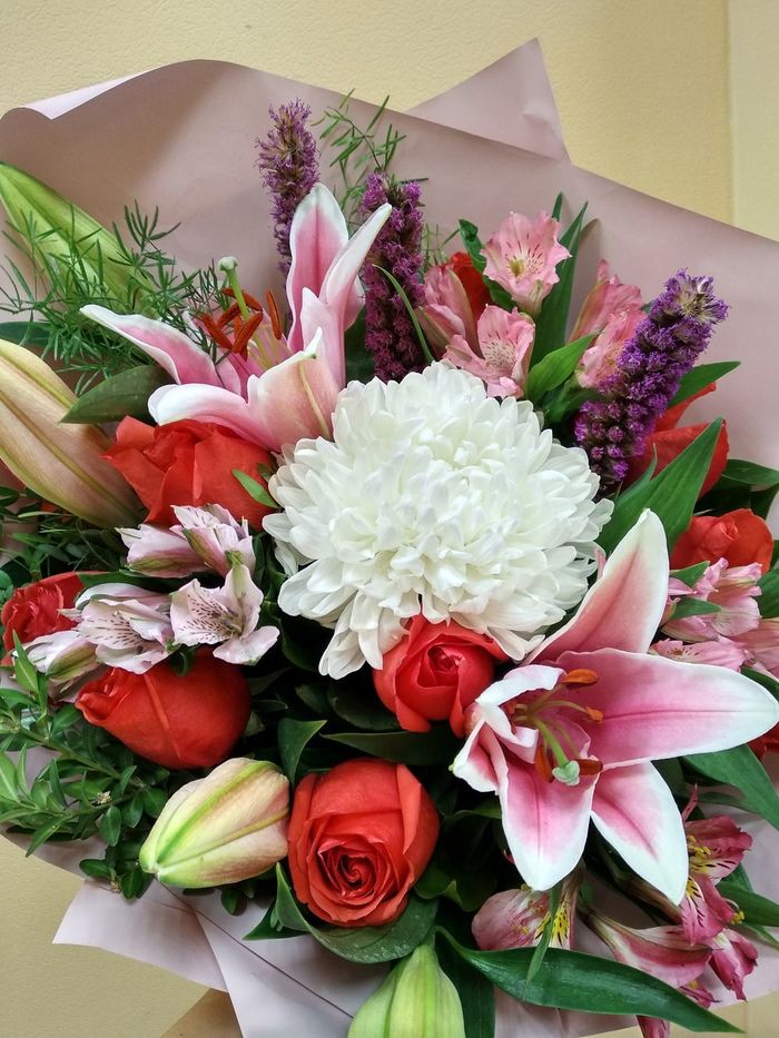 Букет цветов с лилией азиатской , хризантемами , альстромерией