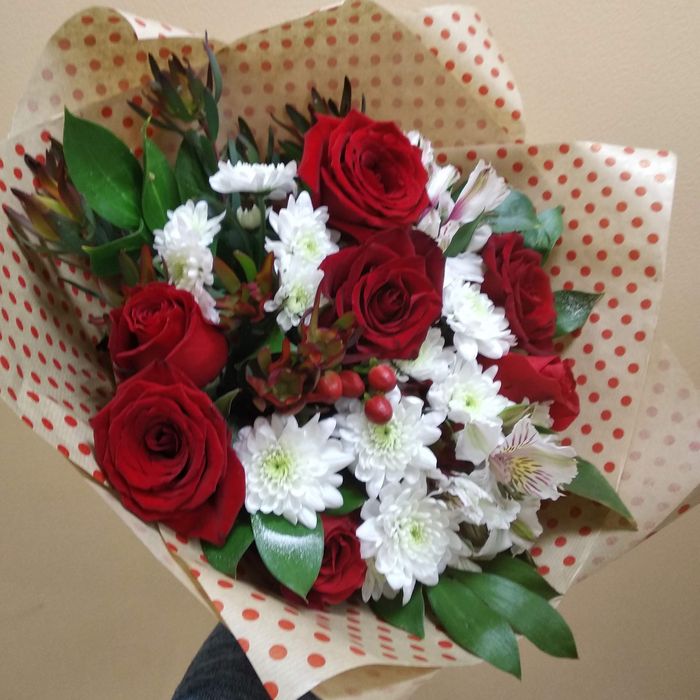 Букет цветов 7 роз высота 60см , хризантемами , альстромерией