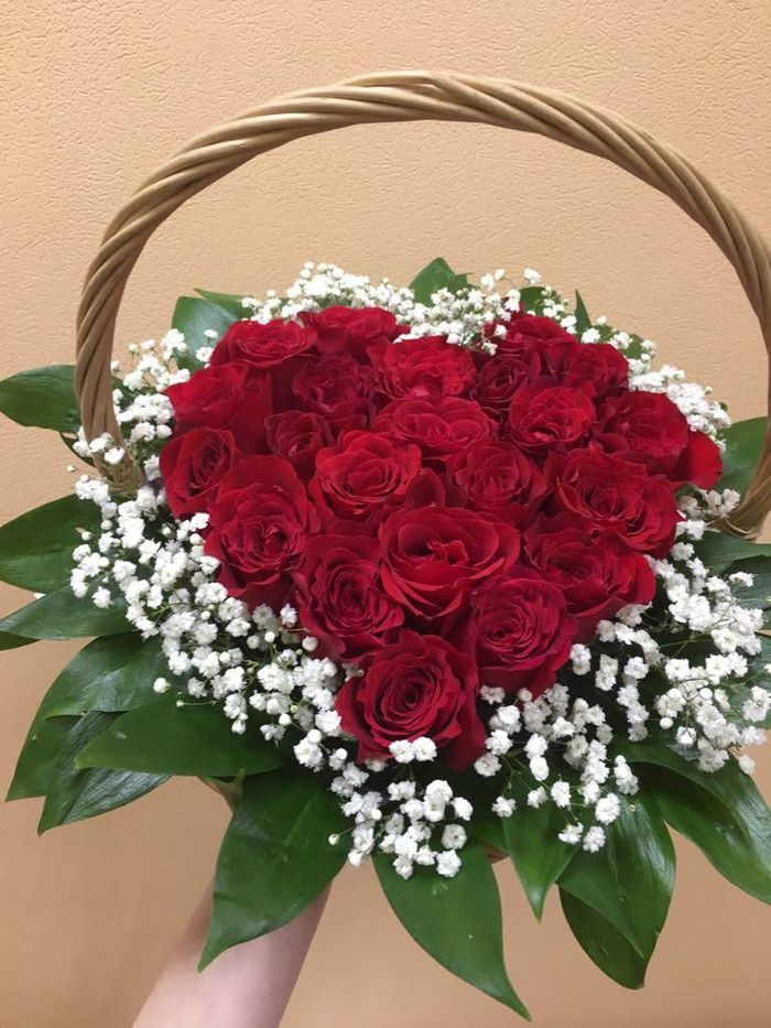 Цветы в корзине , сердце из роз 25 роз высота 60см